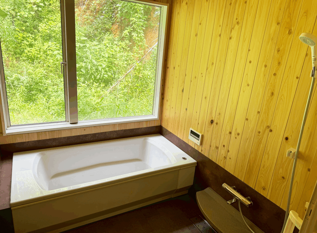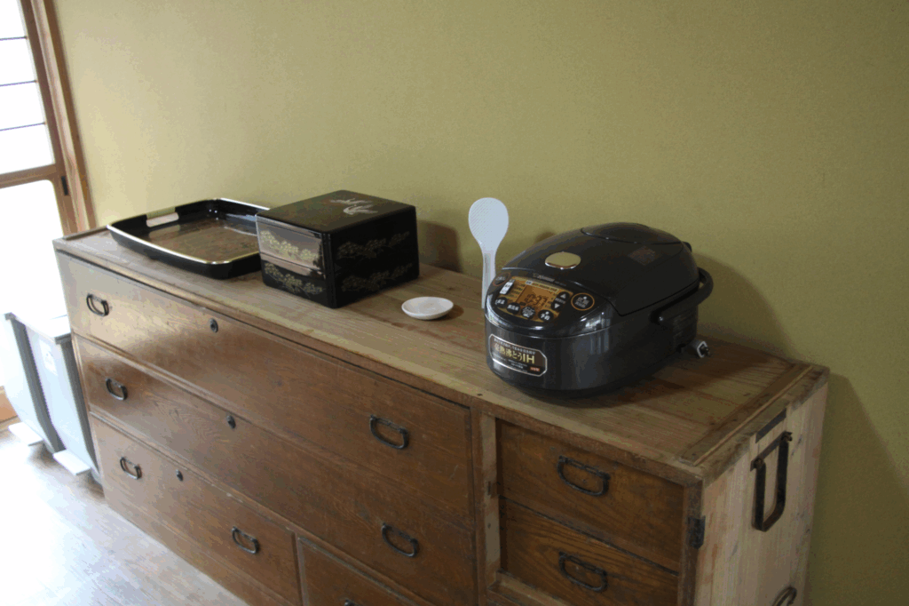 キッチン設備も充実しており、冷蔵庫、電子レンジ、炊飯器、調理器具・食器一式を常備。釣った魚をすぐ料理したり、地元の食材を使って料理を楽しむことができます。窓から差し込む自然光と風通しの良さが、料理や団らんの時間を心地よく彩ります。