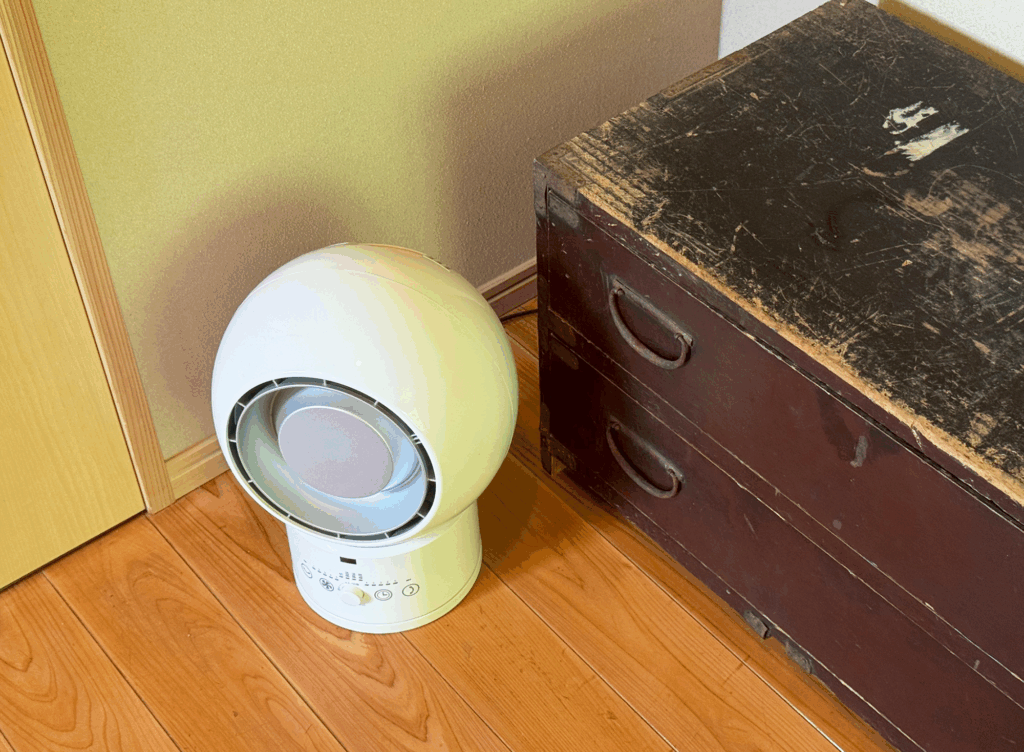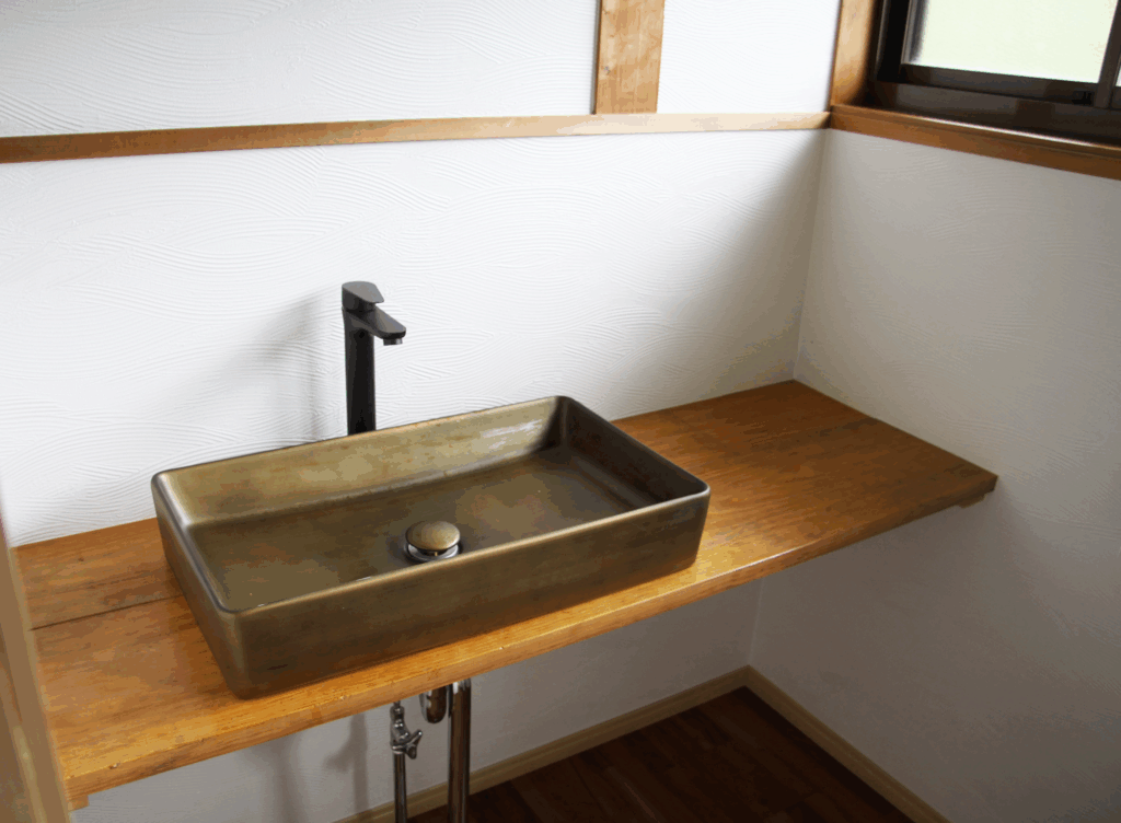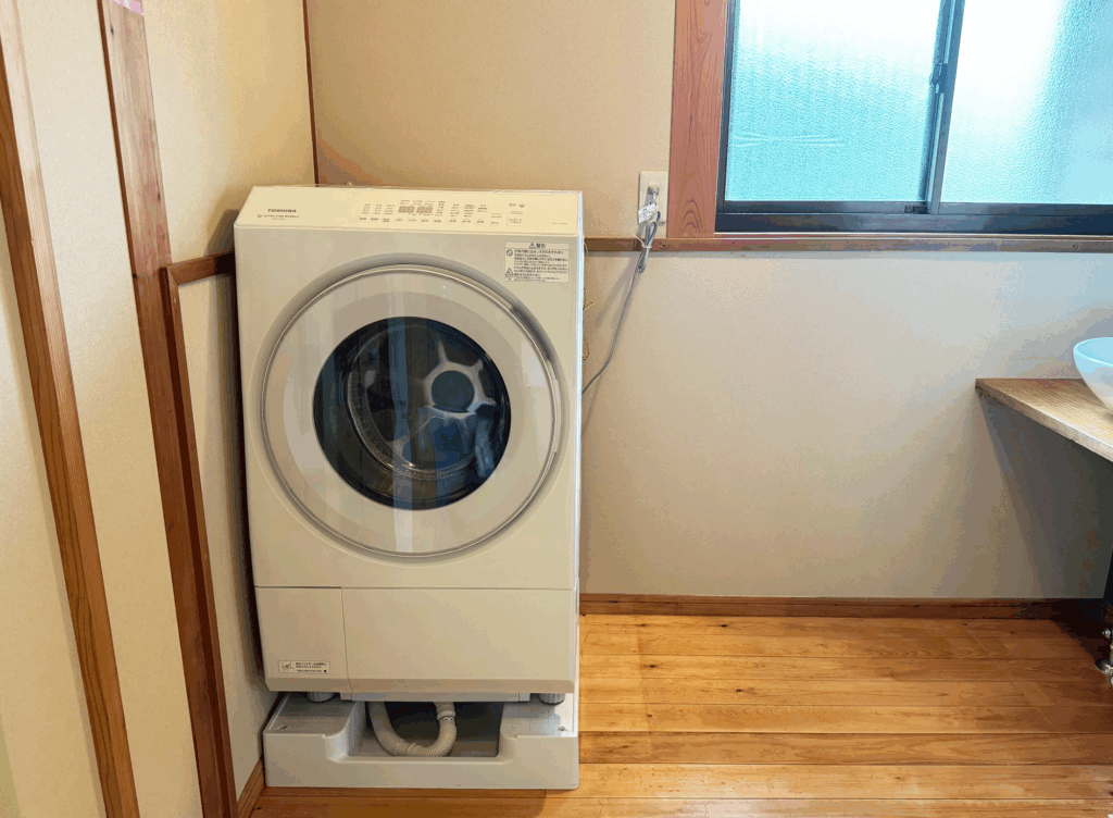 脱衣所にはドラム式洗濯機を設置しており、長期滞在にも対応。洗面にはおしゃれなボウル式洗面器を備え、清潔感とデザイン性を両立しています。サーキュレーターが風の通りをよくし、湿気対策も考慮しています。