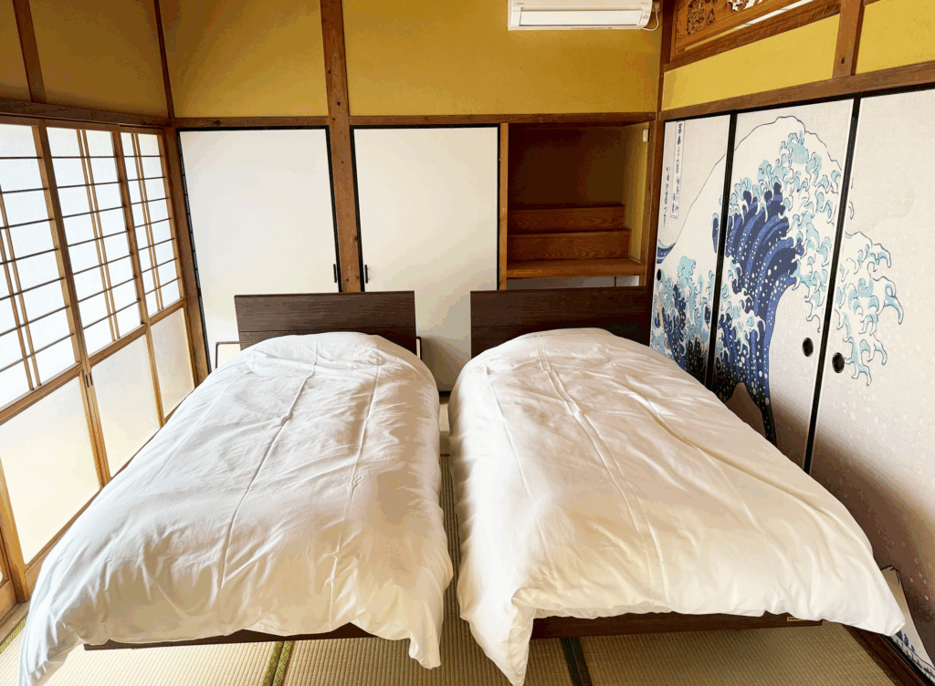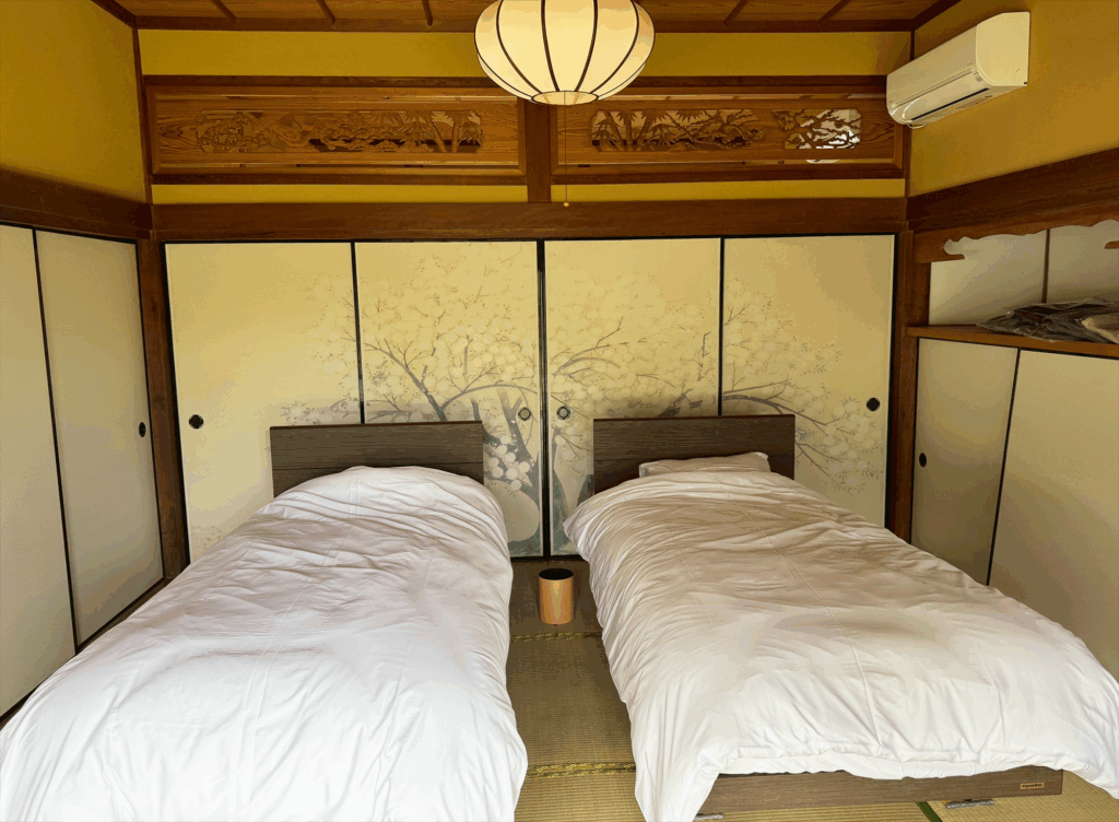 畳の柔らかな足ざわりと、障子越しの柔光が調和する空間です。布団を敷いてゆったりと眠れる仕様で、最大2名まで対応可能。静かに過ごしたいカップルや友人同士にも向きます。